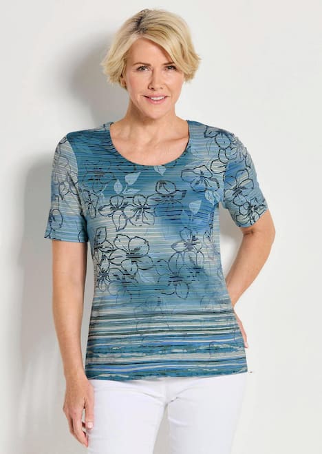Shirt in feiner Ringelstruktur, die mit femininen Blüten apart bedruckt ist. Die weiche Jerseyqualität mit Viskose schmiegt sich angenehm an, der figurumspielende Schnitt bis zur Hüfte gewährt besten Tragekomfort. Mit Rundhalsausschnitt und Halbarm. Länge ca. 66 cm in Gr. 46, ca. 62 cm in Gr. 23.