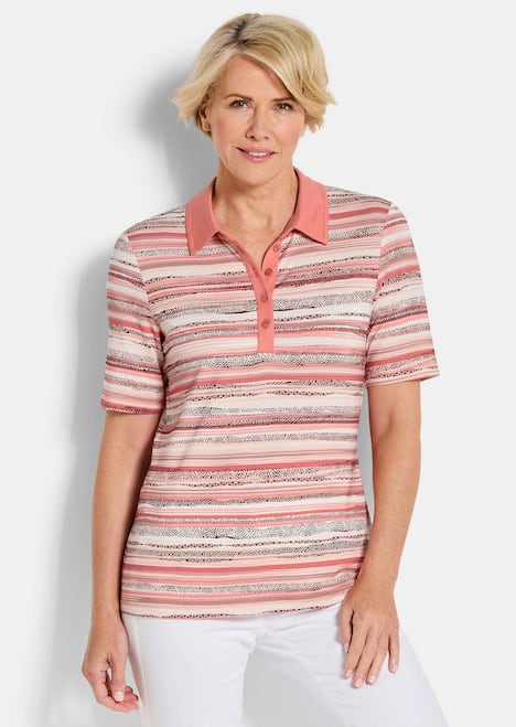 Poloshirt, das die klassische Optik mit Polokragen und Knopfleiste mit dem Komfort eines Jersey-Shirts vereint. Die weiche Viskosequalität trägt sich besonders angenehm, die sanften Ringel mit Ethnomuster sorgen für Frische. In gerader Passform mit Halbarm. Länge ca. 64 cm in Gr. 46, ca. 60 cm in Gr. 23.