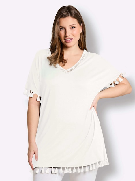 Shirt in Longform. Die dekorativen Quasten sorgen für Boho-Flair und machen das Shirt zum entspannten Strand-Begleiter. Weite Fledermausärmel und ein Spitzenband am V-Ausschnitt ergänzen den verspielten Look.