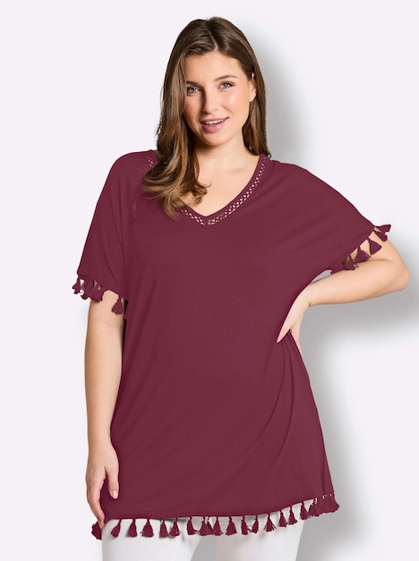 Shirt in Longform. Die dekorativen Quasten sorgen für Boho-Flair und machen das Shirt zum entspannten Strand-Begleiter. Weite Fledermausärmel und ein Spitzenband am V-Ausschnitt ergänzen den verspielten Look.