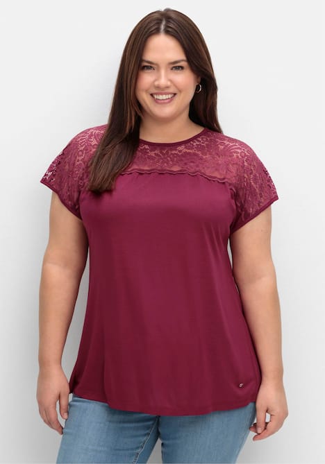 Shirt mit Rundhalsausschnitt. Der edle, transparente Spitzeneinsatz in der Schulterpartie gewährt zarte Einblicke. Hinten schmückt ein Schlüsselloch-Ausschnitt mit Knopfverschluss das Rückenteil. Überschnittene Schultern sowie eine leichte Kräuselung unter der Spitze ergänzen den femininen Look.