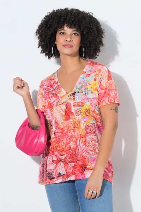 T-Shirt, A-Linie, aus weichem Ausbrennerjersey. Glitzersteinchen auf dem Sommer-Muster. V-Ausschnitt, Halbarm. Saum hinten länger.
