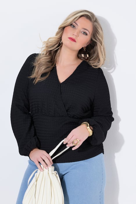 T-Shirt, bequeme Passform, aus weichem Strukurjersey mit gepuffter Schulter und weitem Ballon-Langarm. V-Ausschnitt in Wickeloptik, gekräuselte Seitennaht. Elastischer Ärmelabschluss.