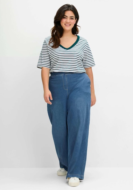 Shirt mit garngefärbten Ringeln. Der V-Ausschnitt wird durch die farblich abgesetzte Blende sportiv betont, die breit gerippte Struktur verleiht der Oberfläche Spannung. Ein etwas längerer Halbarm und die gerade Passform machen den Look komplett.