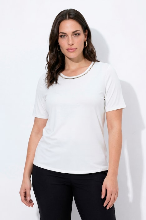 Lyocell-T-Shirt, Classic Fit, aus natürlich weichem Lyocell-Stretchjersey. Highlight: Rundhalsausschnitt mit Glitzersteinchenborte. Halbarm.