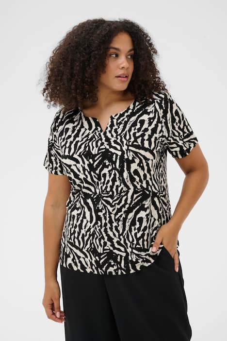 Kurzarmtop mit lockerem Schnitt, Split-Ausschnitt und künstlerischem Muster. Angenehm weiches Material, ideal für Büro und Alltag.