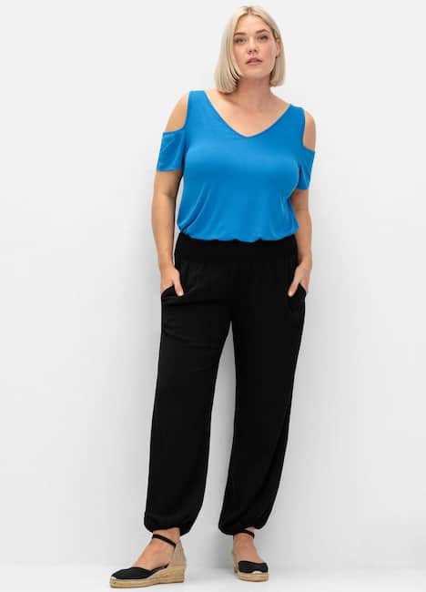 Shirt im Off-Shoulder-Look. Seinen sommerlich-entspannten Look verdankt das Oberteil den Cut-outs an der Schulter. Ein V-Ausschnitt vorn und hinten ist dazu eine feminine Ergänzung.