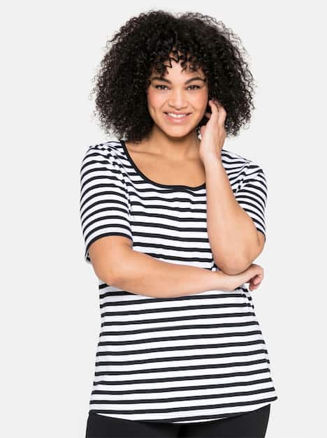 T-Shirt mit farbig abgesetztem Rundhalsausschnitt. Die garngefärbten Ringel kreieren einen charmanten, maritimen Look. Ein leicht gerundeter Saum und etwas länger geschnittene Ärmel machen das Shirt zum idealen Kombipartner.