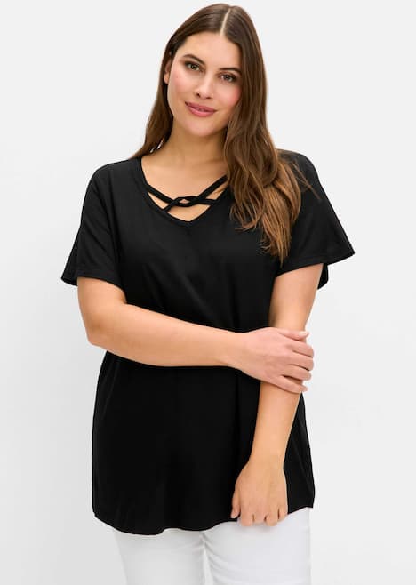 Shirt mit femininen Details. Der V-Ausschnitt wird durch fixierte Zierbänder aus Oberstoff akzentuiert und verleiht dem Shirt einen raffinierten Touch. Kurze Flügelärmel sorgen für Leichtigkeit, die tonige Stickerei am Ärmelsaum sorgt für subtile Eleganz. Die A-Linie sorgt für ein luftiges Tragegefühl und eine fließende Silhouette.