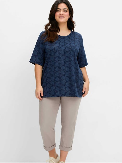 Shirt mit tonigem Jacquardmuster. Dieses Oberteil ist mit einem Rundhalsausschnitt und verlängerten Halbarmen versehen. Abgerundet wird der unkomplizierte Look durch den geraden Saumabschluss.