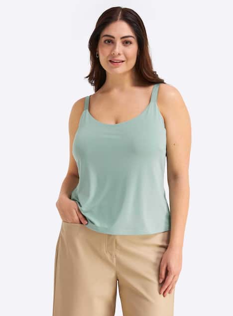Das Oberteil schmiegt sich sanft an den Körper an und trägt durch die doppellagige Verarbeitung nicht auf. Brustabnäher und verstellbare Träger sorgen für eine optimale Passform.