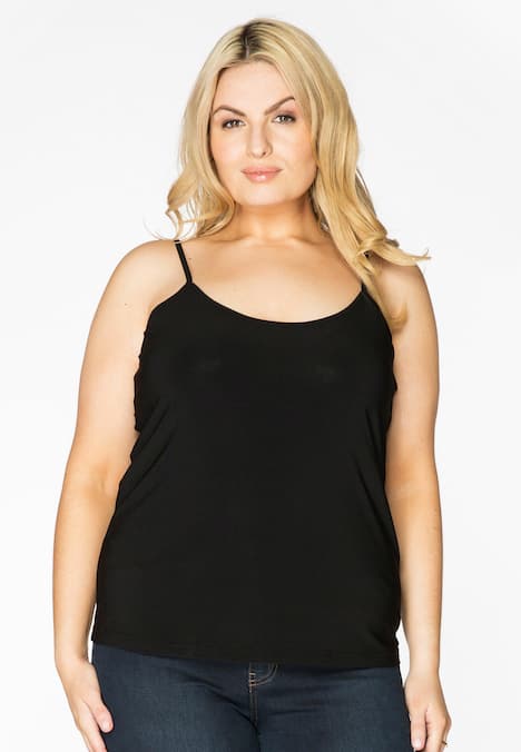 Dieses Basic-Top mit Spaghettiträgern und Rundhalsausschnitt ist figurbetont geschnitten. Es ist ein extrem bequemes Basic, das jeden Look abrundet.