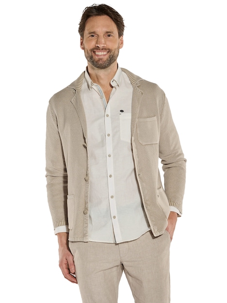 Durch die besondere Strickstruktur ist die Baumwolle bei diesem Strick-Sakko hochwertiger, flexibler und griffiger. Unterschiedliche Strickstrukturen, aufgesetzte Taschen und der unkomplizierte Farbton sind die weitern Designhighlights.