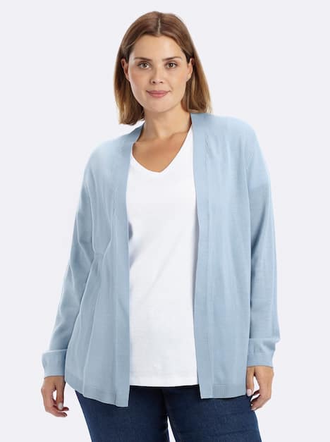 Strickjacke in verschlussloser Form. Durch die offene Verarbeitung fällt die Jacke locker über die Figur. Rippbündchen an allen Abschlüssen ergänzen den zeitlosen, kombistarken Style.