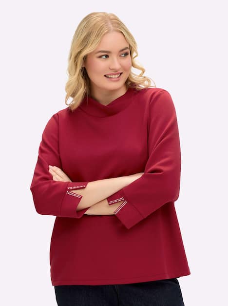 Sweatshirt aus Interlock. Der sportive Look wird durch besondere Details raffiniert ergänzt. So verläuft der bequeme, halsferne Stehkragen vorn und hinten überlappend, hübsch wirkt das ein innen eingearbeitete Tape. Die 3/4-langen Ärmel enden mit geschlitzten Manschetten und werden durch Glitzersteinchen zusätzlich betont.
