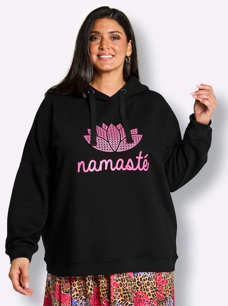 Kapuzensweatshirt von sheego loves miss goodlife. Auf der Vorderseite sticht der kontrastreiche Wordingprint mit dekorativer Yogablüte trendstark ins Auge. Der legere Schnitt mit weit überschnittenen Schultern und die bequemen Rippbündchen unterstreichen den lässigen Charakter.
