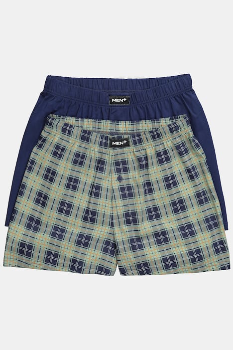 Men+ Boxershorts im Doppelpack - je 1x kariert und einfarbig. Diese bequem weiten Shorts überzeugen besonders in großen Größen durch hautsympathisch weichen Jersey und einen angenehm sitzenden, elastischen Bund mit geknöpftem Eingriff. Men+ - Mode für Männer in jeder Größe. Unsere neue, komplett überarbeitete Passform wird dich überzeugen.
