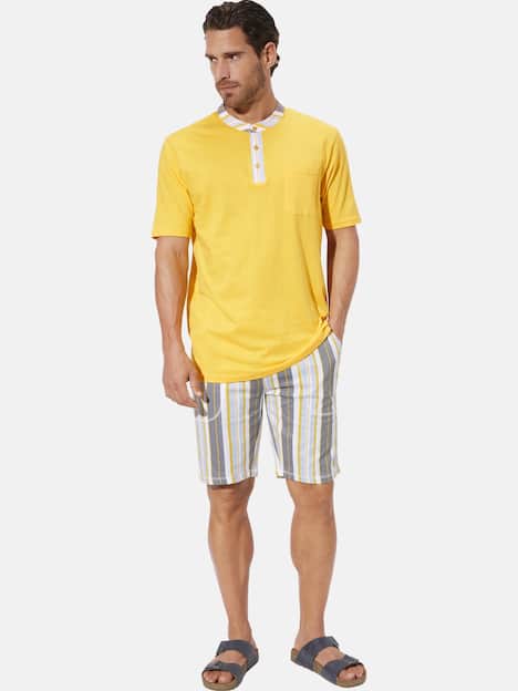 Genießen Sie stilvolle Nächte mit dem bequemen Schlafanzug VILORO von BABISTA. Das Top mit klassischem Henley-Kragen und nützlicher Brusttasche hebt sich von herkömmlichen Designs ab. Die Schlafhose bietet dank ihres dehnbaren Bundes, der leicht mit einem Kordelzug angepasst werden kann, außergewöhnlichen Tragekomfort. Das attraktive Muster und die Seitentaschen runden den lässigen Stil ab. Mit Schlafanzug VILORO sind erholsame Nächte in weichen Betten garantiert. Material 100% Baumwolle. Maschinenwäsche.