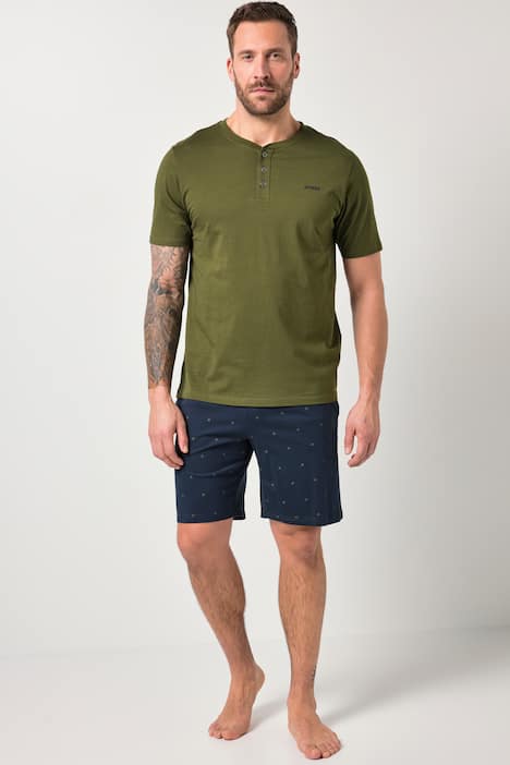 JP1880 Schlafanzug, Zweiteiler. Einfarbiges T-Shirt, Halbarm, mit Henley-Ausschnitt. Hose mit Minimal-Muster, Elastikbund und Kordel. Die getestete Passform wird dich besonders in großen Größen überzeugen. JP1880 - for real men only!