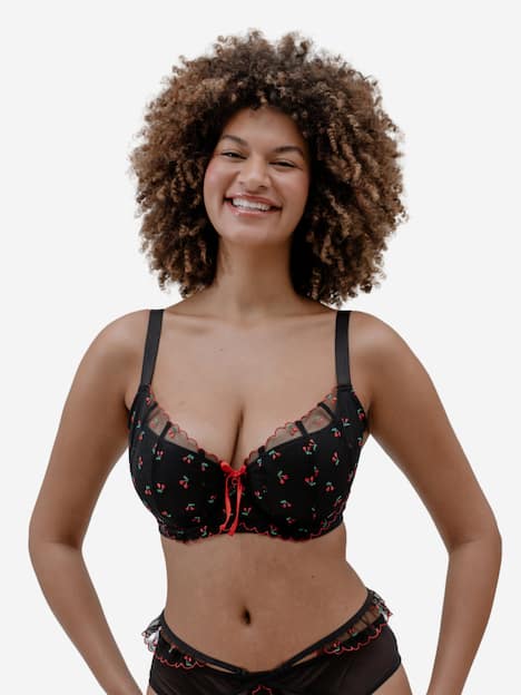 Zum Anbeißen schön! Der Demi-BH Belle black cherry by Paula Lambert lädt Dich mit seinen roten Kirsch-Stickereien auf weichem schwarzem Mesh zum Verlieben ein. Die halb wattierten Cups liften sanft und formen Dein Dekolleté, während die geschickte Nahtführung für Halt, eine wunderschöne Silhouette und hohen Tragekomfort den ganzen Tag über sorgt. Dank integrierter Sideshaper sitzt der BH auch bei größeren Cups sicher und bequem. Freche und gleichzeitig feminine Akzente setzen die verspielte Schleife am Mittelsteg und die rot eingefasste Bogenkante. Auch die feinen Stickereidetails am Trägeransatz im Rücken greifen das Kirsch-Motiv wieder auf.