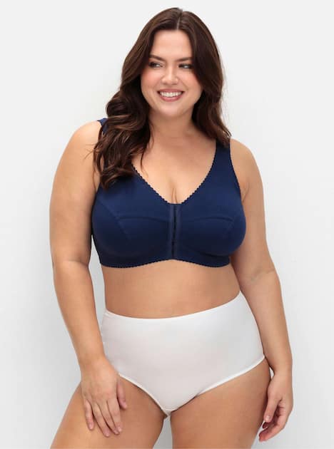 BH mit praktischen Vorderverschluss. Ohne störende Bügel bietet der BH hohen Tragekomfort. Die abdeckende Schnittform und das Unterbrustband stützen die Brust, die breiten Träger bieten zusätzlichen Halt. Der wattierte Frontverschluss ist von vorn einfacher zu bedienen.