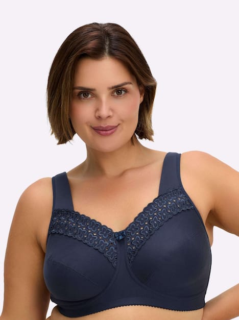 Entlastungs-BH ohne Bügel von Miss Mary of Sweden. Wunderschön mit Spitzenstickerei entlang der 2-geteilten Cups. Super bequem durch die breiten, gepolsterten und im Rücken verstellbaren Träger. Hakenverschluss hinten.