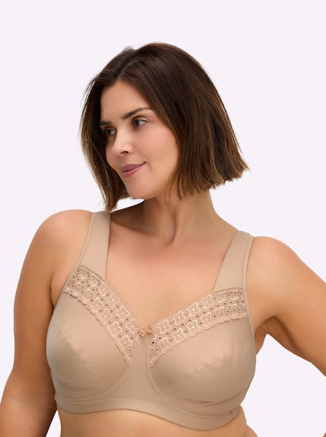 Entlastungs-BH ohne Bügel von Miss Mary of Sweden. Wunderschön mit Spitzenstickerei entlang der 2-geteilten Cups. Super bequem durch die breiten, gepolsterten und im Rücken verstellbaren Träger. Hakenverschluss hinten.