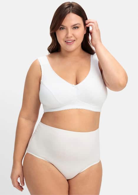 Entlastungs-BH in bügelloser Form. Einen optimalen Sitz versprechen die breiten Träger, auch der eingearbeitete Unterbrustgummi stützt optimal die Brust. Die abdeckende Schnittform gibt der Brust auch ohne Bügel Halt. Der wattierte Rückenverschluss ist bequem und genau wie die Träger individuell verstellbar.
