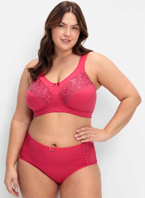 Zwei Entlastungs-BHs im Doppelpack, ohne Bügel. Ein BH ist mit einer schönen Stickerei verziert, während der andere BH schlicht unifarben ist. Breitere, wattierte Träger schneiden nicht ein, das breite Unterbrustband stützt die Brust. Auch die abdeckende Schnittform gibt zuverlässigen Halt und Komfort. Weitere praktische Eigenschaften sind die verstellbaren Träger sowie der verstellbare Rückenverschluss.