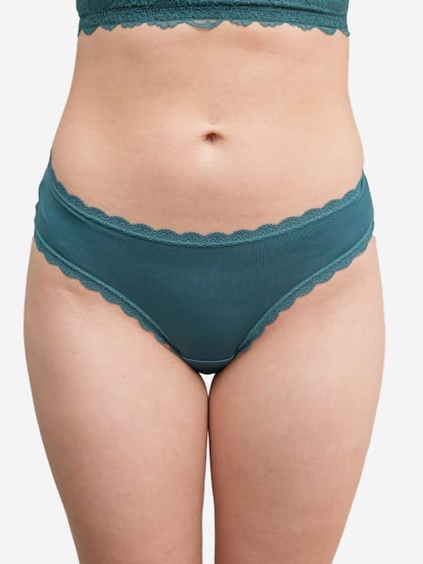 Der String schließt an Bund und Beinausschnitt mit elastischer Spitze ab und schneidet deshalb weder ein, noch zeichnet er sich unter Deiner Kleidung ab.