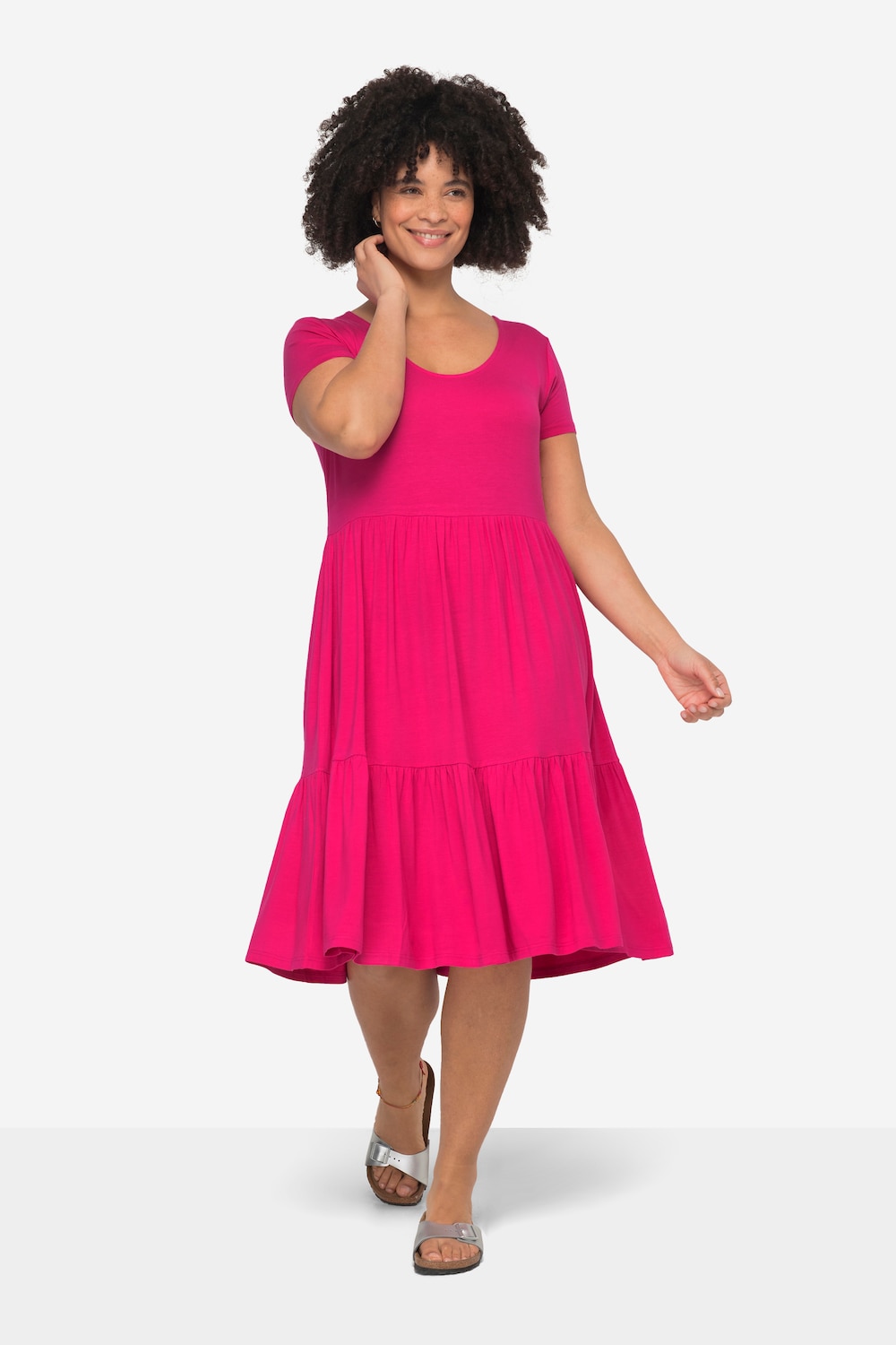 Jerseykleid, A-Line, cold dyed, V-Ausschnitt mit Lochstickerei, Halbarm